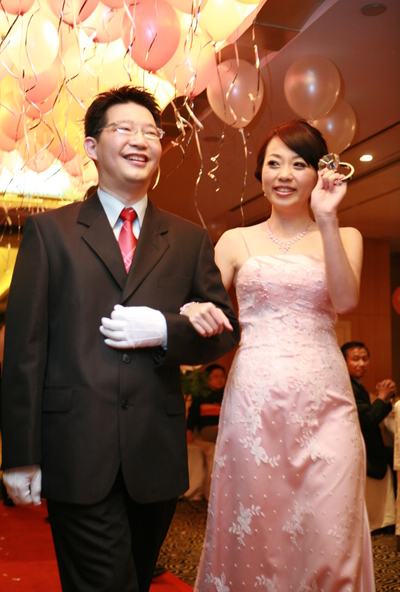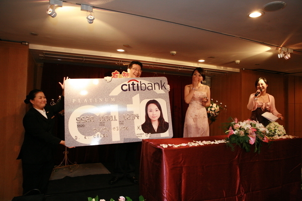 照慣例,總是要做點事,來證明"婚禮是我們的"。老婆之前一直吵著要我辦一張副卡給她,所以就靠著友人資助的信卡圖片,還有騙她給的大頭照,做了一張大大的信用卡送她。這張信用卡是廣告公司幫我輸出的,我用自己的求婚MV給美術小妹妹看,她們在大為感動之餘,幫做了這張卡。費用約1000元,算是又便宜又有效果的