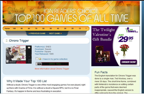 IGN,國外目前最大最著名的遊戲網站,每年都會發佈「Top100」的遊戲。在2008年,仍然將<超時空之鑰>列為第二名。
