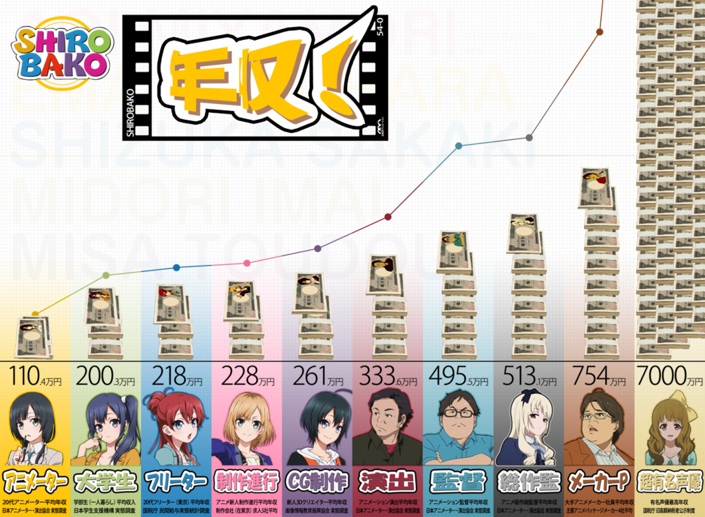 有人把整部動畫的薪水都PO上來。從這裡可以看到,擔任專屬原畫師的薪水比打工的聲優薪水還低,像是台灣的22K。所以新人原畫師就常常回去吃自己煮中餐省錢。整個悲劇啊~~~
