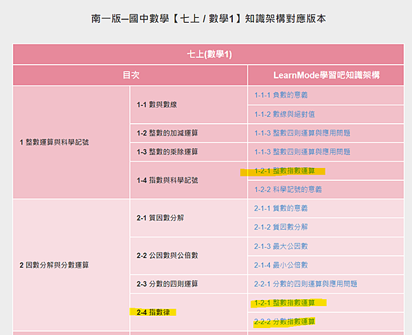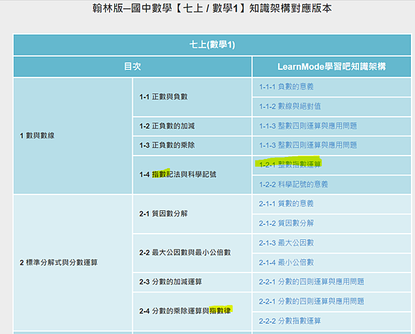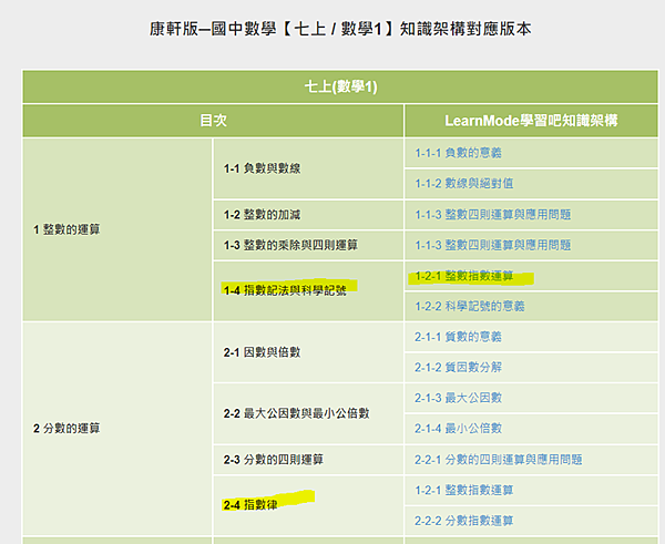 在康軒南一2個版本中,會發現在2-4的指數律的子項下,會重復出現「1-2-1 整數指數運算」。翰林版本在2-4時,也是有整數的指數運算,只是沒有寫出章節名;因為我孩子就是用翰林,她們就也是在2-4時開始大量的整數指數的運算。