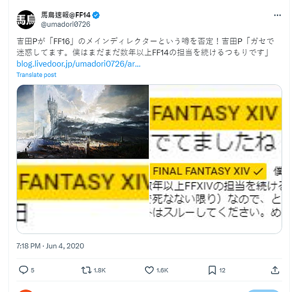 FF16之後,他和那群朋友研究討論完,某次聚會就和我講述上面的資訊。事後我查證了資料,確實吉田在2020/9月前,多次否認有管到FF16。